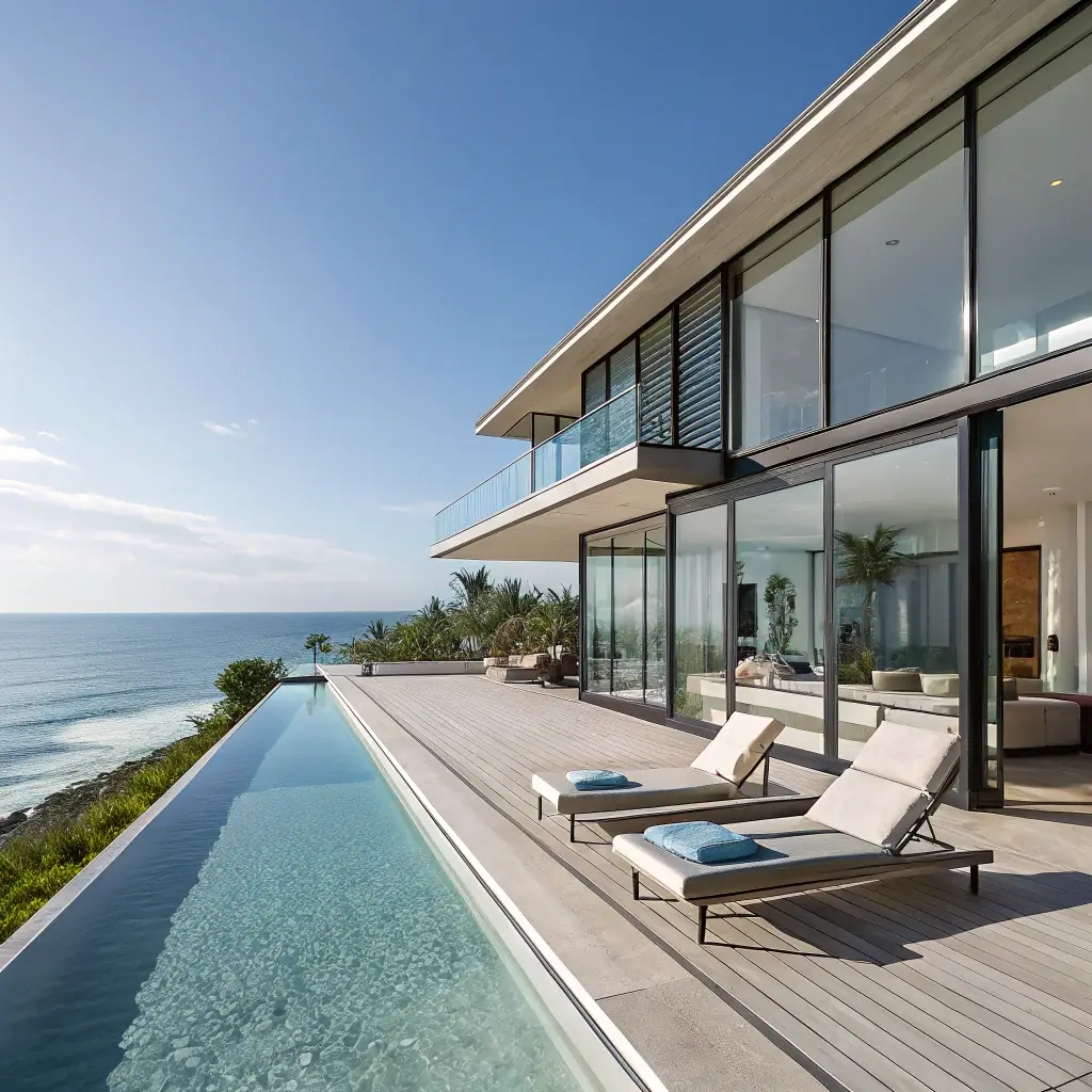This luxury infinity pool features a sleek design with a seamless edge that creates the illusion of water extending to the horizon. Constructed with eco-friendly materials, it emphasizes sustainability without compromising elegance. The pool is complemented by modern lighting and a minimalist surrounding deck. Perfect for modern outdoor spaces seeking a luxurious yet environmentally conscious touch.